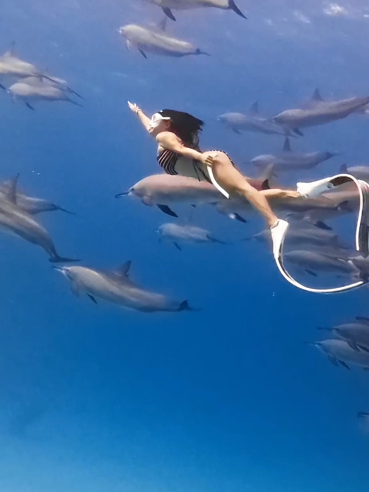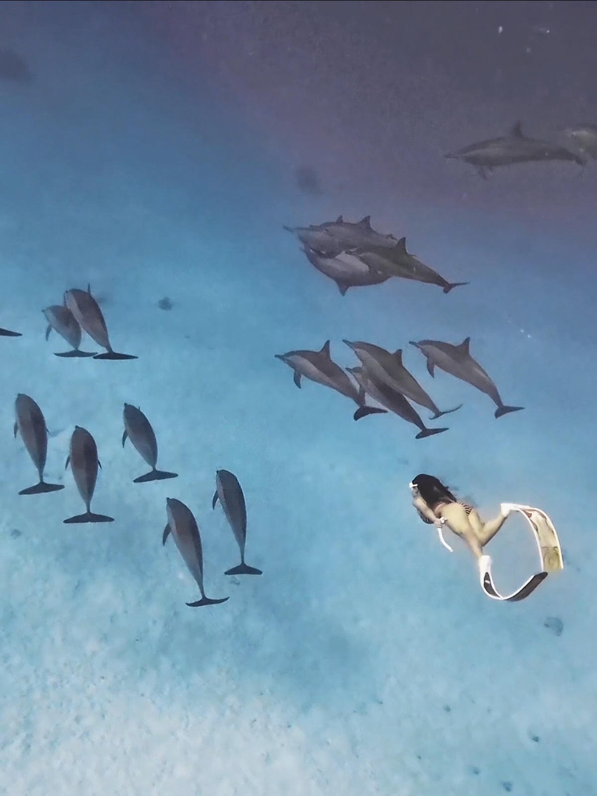 船上潜导因为照顾较多客人,所以无法拍摄。我们的专业摄影师会为您捕捉人与海豚同框的精彩画面,并提供后期调色和剪辑,你需要做的主要是放松和自然游动。